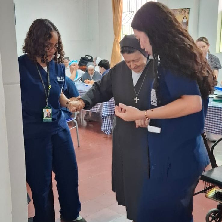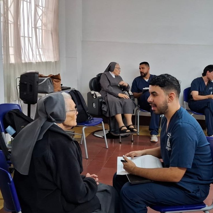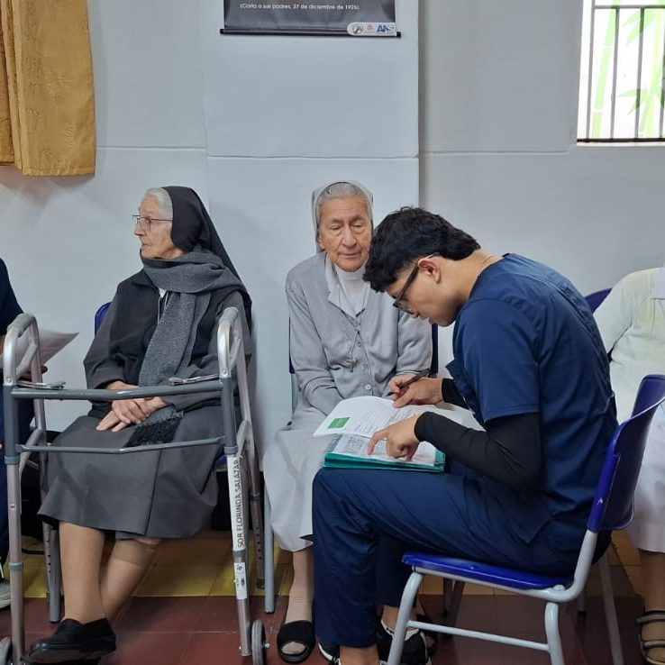 Al llegar, los estudiantes reciben la historia clínica de cada hermana, conociendo el manejo de sus enfermedades y los medicamentos que toman. Desde esta mirada profesional y humana, realizan una valoración integral que incluye control de peso, talla y seguimiento especial a quienes presentan condiciones como la diabetes. Posteriormente, ofrecen recomendaciones orientadas a fortalecer una alimentación equilibrada y saludable, y entregan un informe escrito individual con las respectivas sugerencias.